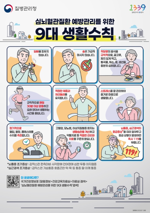 질병관리청은 이같은 내용을 담은 뇌졸중과 심근경색의 위험성과 대응요령에 관한 ‘심뇌혈관질환 예방관리를 위한 9대 수칙’을 마련한 바 있으며, 질병관리청 누리소통망을 통해 홍보콘텐츠를 게시하는 등 뇌졸중과 심근경색을 예방하기 위해 노력하고 있다.