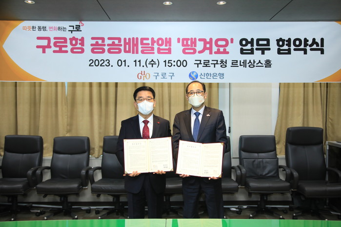 | ▲ 11일 구로구청 르네상스홀에서 문헌일 구로구청장(왼쪽)과 한용구 신한은행장이 '구로 땡겨요' 공공배달앱 업무협약을 맺은 뒤 기념사진을 촬영하고 있다. 2023.1.12. |