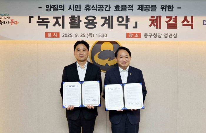 [코리아 이슈저널=홍춘표 기자] 인천 동구는 지난 25일 동원로엑스㈜(인천㈜ 대표이사 최안석)와‘녹지활용계약’을 체결했다고 밝혔다. 인천 최초로 진행된 이번 계약은 민간기업이 소유한 사유지를 주민에게 열린 녹지로 제공하는 새로운 방식의 민관 협력 모델이다.