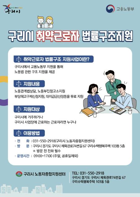 신청 자격은 구리시에 거주하거나 구리시에 있는 기업에 근무하는 근로자로, 전화 또는 센터 방문을 통해 상담 후 지원받을 수 있다. 구리시는 대상자로 선정된 근로자에게 상담부터 노동 관련 법률구조까지 전액 무료로 제공한다.