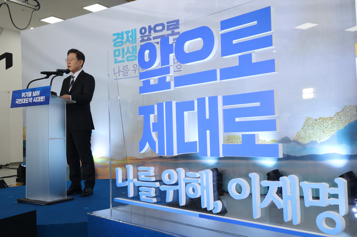 이 후보가 회견을 진행한 단상 백드롭에는 새로운 슬로건을 응용한 '경제 앞으로 민생 제대로 나를 위해 이재명'이라는 문구가 붙었다.