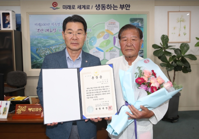 [코리아 이슈저널=김종오 기자] 부안군은 14일 부안군청 군수실에서 6·25전쟁 참전유공자인 고(故) 심기동 상병의 조카 심유섭(77) 씨에게 화랑무공훈장을 전수했다.