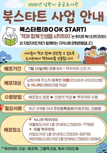 연령단계별로 선정된 그림책 2권과 가이드북, 전용 에코백으로 구성된 ‘북스타트 책꾸러미’는 남원시에 주소지를 둔 2018~2025년생 아동 및 1966년생 이상 시니어를 대상으로 선착순 배포된다.