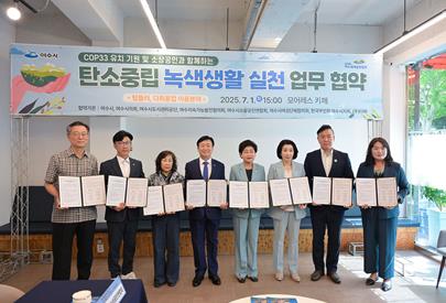[코리아 이슈저널=김종오 기자] 여수시는 지난 1일 제33차 유엔기후변화협약 당사국총회(COP33) 유치와 2026여수세계섬박람회의 성공적인 개최를 위해 7개 기관·단체와 ‘탄소중립 녹색생활 실천 업무협약’을 체결했다고 2일 밝혔다.