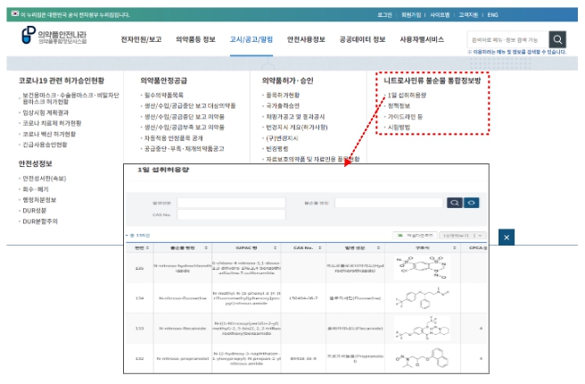 [코리아 이슈저널=김윤영 기자] 식품의약품안전처는 니트로사민류 불순물 관련 정보에 대한 제약업계의 접근성을 높여 철저한 의약품 안전관리를 할 수 있도록 8월 28일부터 의약품안전나라에서 니트로사민류 불순물 관련 정보를 통합 제공한다고 밝혔다.
