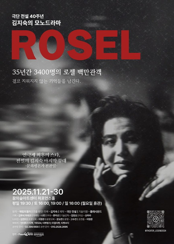 [코리아 이슈저널=최용달 기자] 극단 전설 40주년 기념작이자 배우 김지숙의 마지막 공연인 모노드라마 〈로젤〉이 오는 11월 21일부터 30일까지 꿈의숲아트센터 퍼포먼스홀에서 막을 올린다. 35년간 3,400회 이상 공연되며 백만 명이 넘는 관객을 울린 이 작품은 여성의 주체성과 인간성의 회복을 그린 한국 연극사의 대표작으로 꼽힌다.