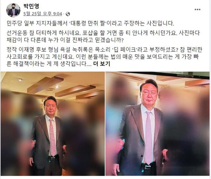 국민의힘 박민영 대변인은 자신의 페이스북에서 해당 사진이 '포토샵' 처리가 된 가짜 사진이라며 민주당을 역공했다.
