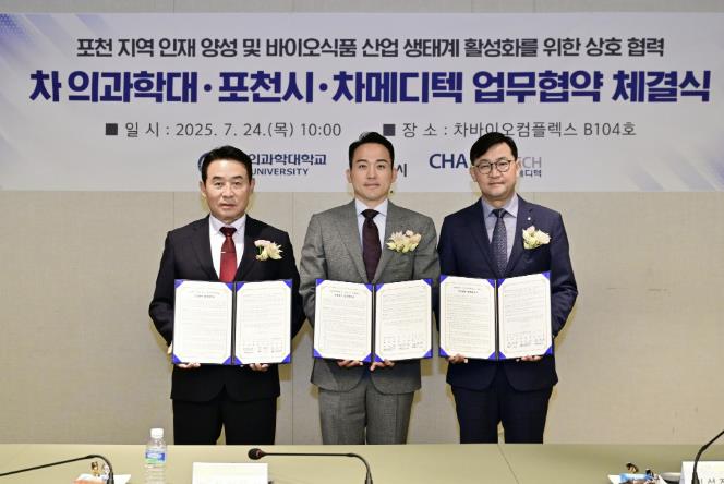 [코리아 이슈저널=홍춘표 기자] 포천시는 지난 24일 차바이오컴플렉스에서 차의과학대학교, 차메디텍과 포천 지역인재 양성 및 바이오식품 산업 생태계 활성화를 위한 3자 간 업무협약을 체결했다.
