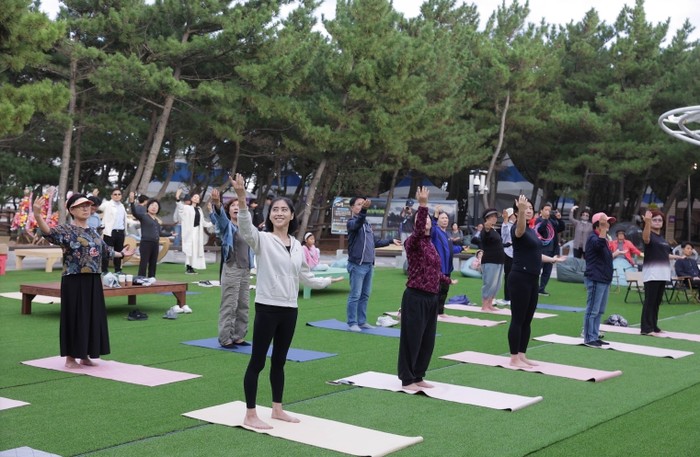 ▲ 2024년도 영덕국제H웰니스페스타 현장에서 방문객들이 요가 체험을 하고 있다.