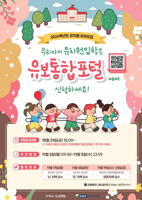 [코리아 이슈저널=김태훈 기자] 대구시교육청은 오는 11월 3일부터 ‘유보통합포털을 통해 2026학년도 유치원 신입생을 모집한다고 밝혔다.