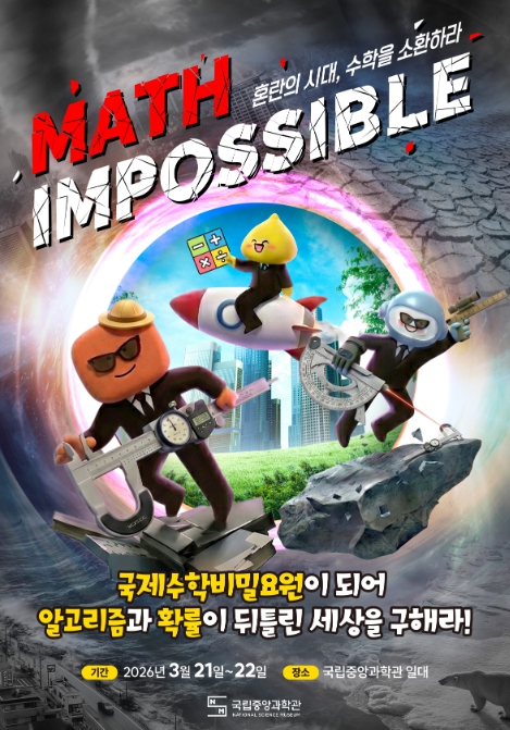 [코리아 이슈저널=최용달 기자] 과학기술정보통신부 국립중앙과학관은 3월 21일부터 22일까지 양일간, 관람객이 주인공이 되어 수학적 사고로 위기를 극복하는 임무형(미션형) 수학 행사 ‘Math Impossible: 혼란의 시대, 수학을 소환하라!’를 개최한다.