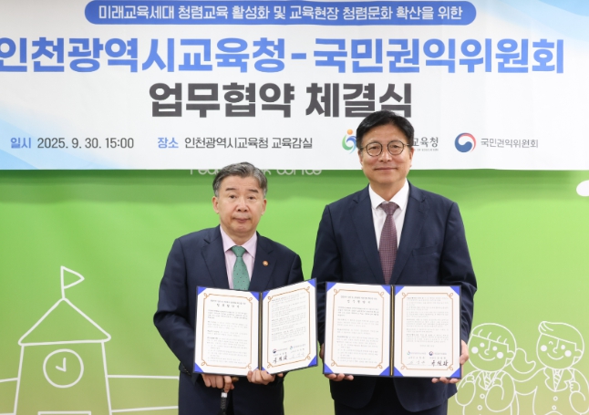 [코리아 이슈저널=홍춘표 기자] 인천광역시교육청은 9월 30일 국민권익위원회와 청렴한 미래인재 양성과 교육 현장의 청렴 문화 확산을 위한 업무협약을 체결했다.