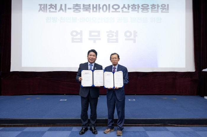 [코리아 이슈저널=홍종수 기자] 제천시는 9월 30일 ‘2025 제천국제한방천연물산업엑스포’ 기간 중 한방생명과학관 다목적강당에서 충북바이오산학융합원과 한방·천연물산업 발전을 위한 업무협약(MOU)을 체결했다.