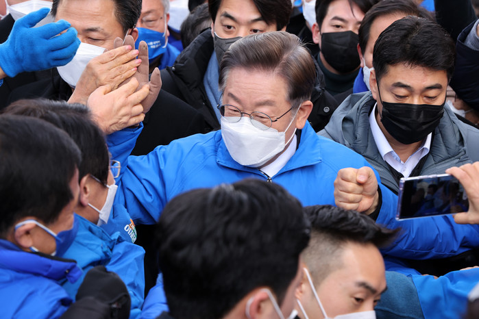 | ▲ 더불어민주당 이재명 대선후보가 18일 전남 순천시 연향패션거리에서 열린 '약무호남 시무국가' 순천 유세에서 지지자들과 인사하고 있다. 2022.2.18 |