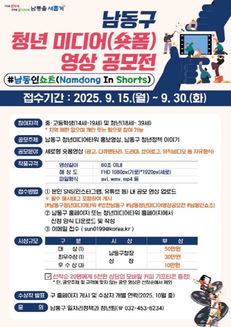 [코리아 이슈저널=홍춘표 기자] 인천시 남동구는 청년과 청소년의 창의적인 시각으로 지역의 매력을 재조명하고, 주민과의 소통을 확대하기 위해 남동구 청년 미디어(숏폼) 영상 공모전 ‘#남동인쇼츠(Namdong In Shorts)’를 개최한다고 31일 밝혔다.