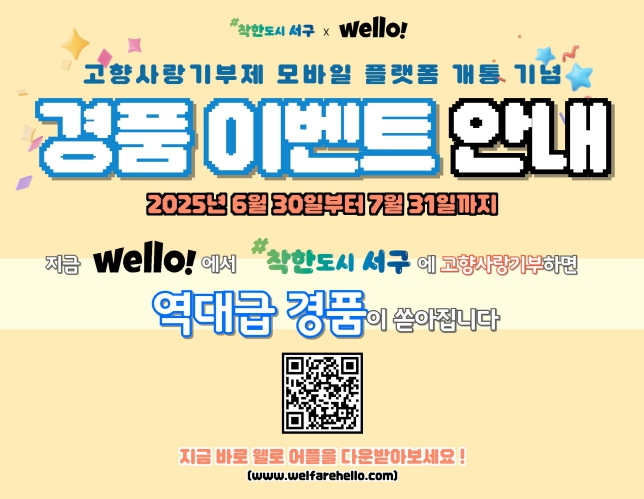 서구는 모바일앱 ‘웰로’를 통한 기부를 유도하기 위해 7월 한 달간 광주 서구에 10만원 이상 기부한 참여자 중 추첨을 통해 총 300만원 상당의 경품(로봇청소기 등)을 제공할 계획이다.