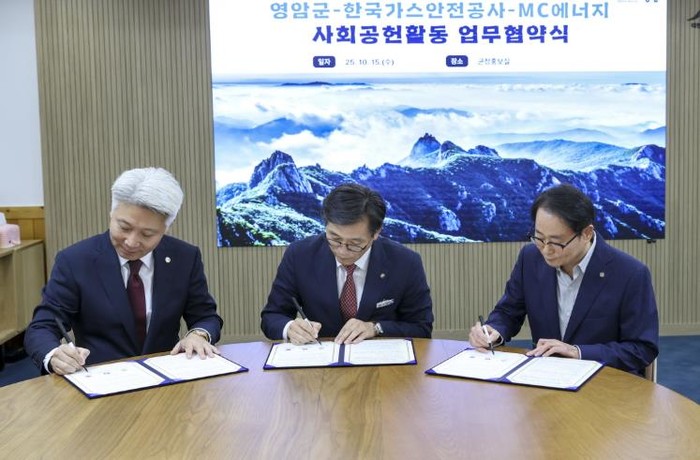 [코리아 이슈저널=김종오 기자] 영암군이 15일 군청에서 한국가스안전공사 전남서부지사, MC에너지(주)와 ‘사회공헌활동 업무협약’을 맺었다.