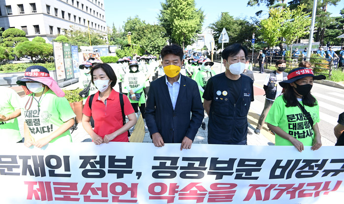 [열린의정뉴스 = 김윤영 기자] 정의당 여영국 대표(가운데)와 진보당 김재연 상임대표가 3일 오전 서울 여의도 국회 정문에서 열린 국민건강보험고객센터노조 직접고용 촉구 청와대 도보행진 및 기자회견에 참석하고 있다. 2021.9.3