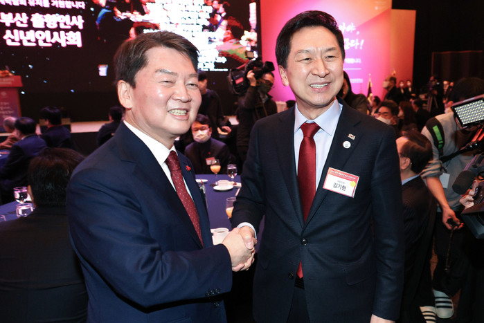 | ▲ 국민의힘 김기현 의원(오른쪽)이 16일 오후 서울 중구 롯데호텔에서 열린 2023 부산 출향인사 초청 신년인사회에서 안철수 의원과 악수를 하고 있다. 2023.1.16 |