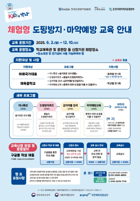 체험부스에서는 마약·도핑 예방 전문 강사의 이론 설명과 함께 부작용 고글 체험, 금지약물 빙고 달리기, 윷놀이 예방 퀴즈 등 다양한 활동을 통해 마약·도핑의 위험성 등을 흥미롭고 몰입도 있게 교육하며, 관심 있는 체육 분야 청소년 관련 어느 기관에서나 무료로 신청할 수 있다.