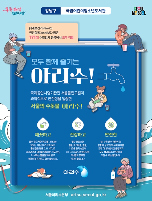 [코리아 이슈저널=최준석 기자] 서울시가 공공도서관을 찾는 시민에게 안심하고 마실 수 있는 수돗물을 제공하기 위해 실시한 정밀 수질검사에서 모든 항목이 ‘먹는물 수질기준’에 적합한 것으로 나타났다.
