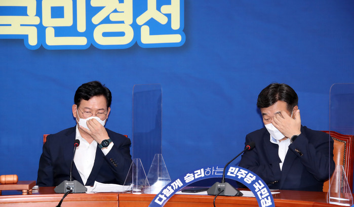 | ▲ 더불어민주당 송영길 대표(왼쪽), 윤호중 원내대표가 1일 서울 여의도 국회에서 열린 최고위원회의에서 최고위원들의 발언을 듣고 있다. 2021.9.1 [연합뉴스 제공] |