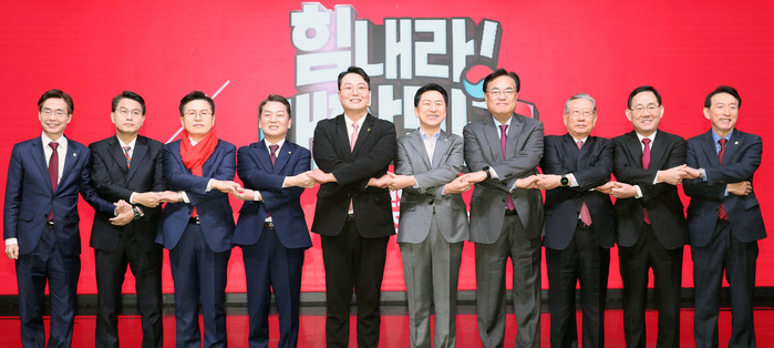 | ▲ 7일 오전 서울 강서구 한 방송 스튜디오에서 열린 국민의힘 제3차 전당대회 후보자 비전 발표회에서 정진석 비대위원장, 주호영 원내대표 등 당 지도부와 당 대표 후보들이 기념촬영을 하고 있다. 왼쪽부터 조경태, 윤상현, 황교안, 안철수, 천하람, 김기현 당 대표 후보, 정진석 비상대책위원장, 유흥수 전당대회 선거관리위원장, 주호영 원내대표, 김석기 사무총장. 2023.2.7 [국회사진기자단] |