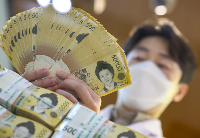 사진은 7일 오전 서울 중구 하나은행에서 직원이 5만원권을 펼쳐보이고 있다. 2022.1.7
