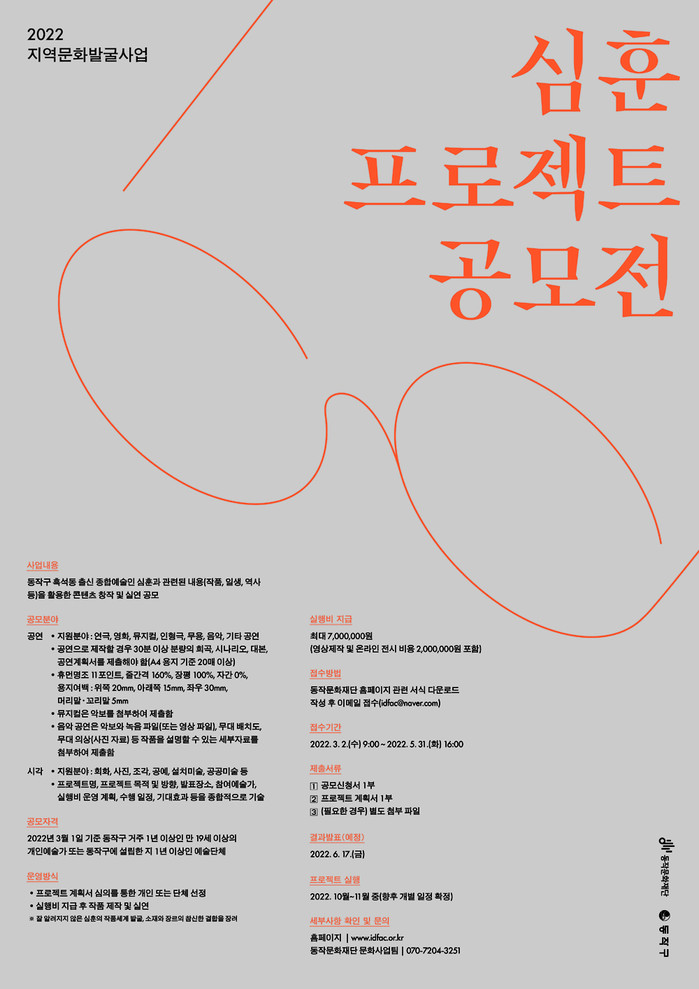 이번 공모 사업에 대한 자세한 내용은 동작문화재단 홈페이지 공고(www.idfac.or.kr)를 통해 확인하거나 동작문화재단(070-7204-3251)으로 문의하면 된다.