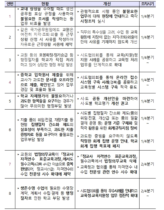 먼저, 학생에게 교내 상장을 수여할 때 공무원의 포상 규정을 적용하여 공적 조서를 작성하는 등 관행적으로 해오던 불필요한 업무를 시정하도록 현장에 안내한다. 1급 정교사 자격연수에서 법정의무교육을 과도하게 편성하던 관행을 개선해 전문성 향상을 위한 과목을 확대할 예정이다.