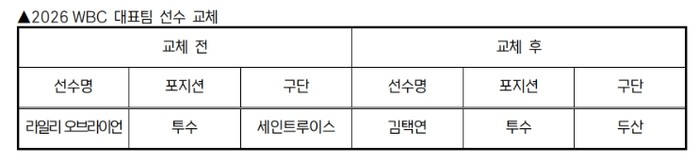 [코리아 이슈저널=최용달 기자] KBO 전력강화위원회는 부상으로 인해 WBC 참가가 어려워진 세인트루이스 라일리 오브라이언을 대체할 선수로 두산 김택연을 확정하고 WBC 조직위에 선수 교체 승인을 요청했다.