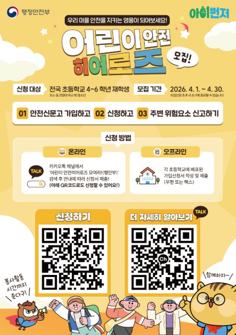 [코리아 이슈저널=최용달 기자] 행정안전부는 4월 1일부터 30일까지 ‘어린이 안전히어로즈’ 신규 대원을 모집한다.