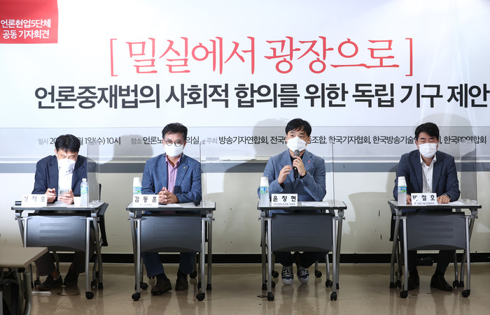 언론협업단체들은 이날 한국프레스센터 18층 언론노조 회의실에서 기자회견을 열고 "'언론과 표현의 자유 위원회'를 통해 민주당과 국민의힘 협의체가 내놓을 개정안을 냉정하게 평가하고 독자적인 대안을 제시하고자 한다"고 말했다.