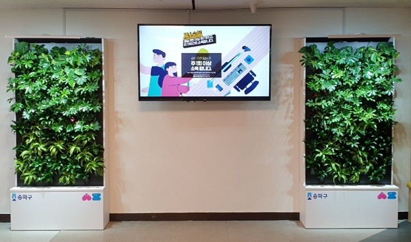 구는 9천 8백만 원의 예산을 확보하여, 1,000㎜(W)×2,100㎜(H)×350㎜(D) 규격의 수직정원 15개를 제작, ▶송파구청 내 1층 로비(2개), 2층 로비(2개), 4층 로비(6개), 구청어린이집(1개)과 ▶송파어린이문화회관 내 1층 로비(1개), 상상마루체험관(1개), 공연장(2개)에 지난 12월 9일 수직정원 설치를 완료했다.
