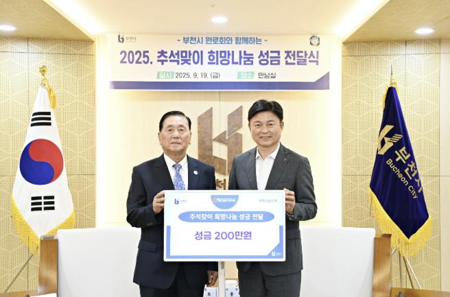 [코리아 이슈저널=홍춘표 기자] 부천시는 지난 19일 부천시청 만남실에서 부천시 원로회가 추석을 앞두고 희망나눔 성금 200만 원을 전달했다고 밝혔다. 전달식에는 조용익 부천시장이 참석해 지역사회 나눔에 앞장서는 원로회에 감사의 뜻을 표했다.