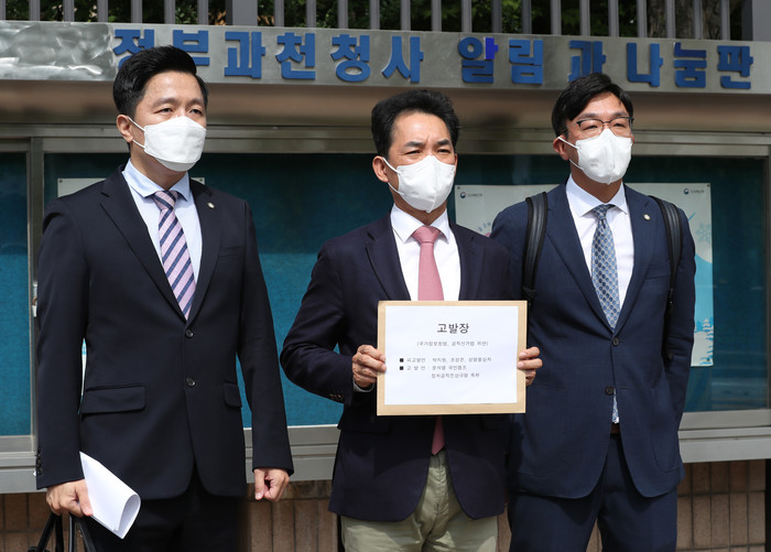 ▲ 윤석열 국민캠프 정치공작 진상조사 특별위원회 소속 박민식(가운데) 전 의원과 변호인들이 13일 오전 정부과천청사 앞에서 고위공직자범죄수사처에 박지원 국정원장과 조성은 씨 등을 국가정보원법 및 공직선거법 위반 혐의로 고발장을 접수하기 전 기자회견을 하고 있다. 2021.9.13 [연합뉴스 제공]
