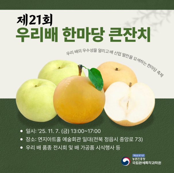 농촌진흥청은 11월 7일 전북특별자치도 정읍시 연지아트홀 일대에서 ‘제21회 전국 우리배 한마당 큰잔치’를 연다.
