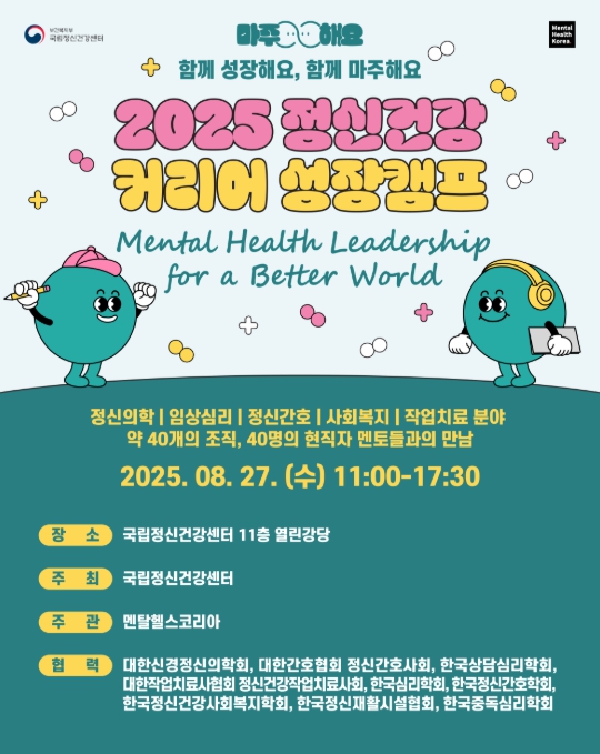 [코리아 이슈저널=김윤영 기자] 보건복지부 국립정신건강센터는 멘탈헬스코리아와 함께 8월 27일 국립정신건강센터 열린강당 11층에서 '2025 정신건강 커리어 성장캠프'를 개최한다.