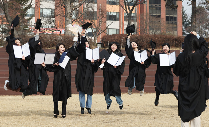 [열린의정뉴스 = 김윤영 기자] 7일 오전 경기도 수원시 권선구 수원여자대학교에서 열린 제48회 학위수여식에서 졸업생들이 점프하며 기념사진을 찍고 있다. 2023.2.7