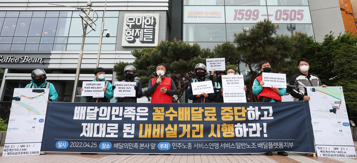 이들은 배달료 책정 기준이 되는 배달의민족 자체 개발한 내비게이션이 육교, 역주행 등을 안내하는 등 이륜차 운영에 부합하지 않는다며 이에 대한 개선을 촉구했다. 또한 내비게이션 오류로 인해 피해를 본 배달노동자에 대한 배상을 요구했다. 2022.4.25