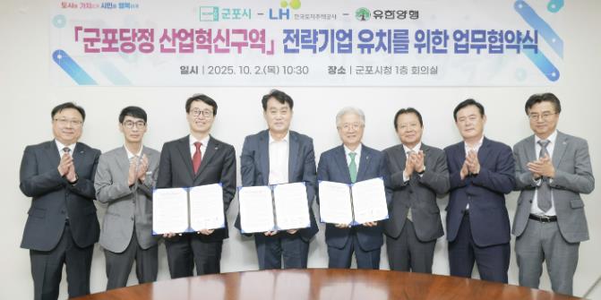 [코리아 이슈저널=홍춘표 기자] 군포시는 2일 군포시청에서 한국토지주택공사(LH), ㈜유한양행과 ‘군포당정 산업혁신구역’ R·D 전략기업 유치를 위한 업무협약을 체결했다고 밝혔다.