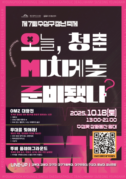 [코리아 이슈저널=김태훈 기자] 대구 수성구는 오는 18일 수성못 상화동산 일대에서 ‘2025 제7회 수성구 청년축제’를 개최한다.