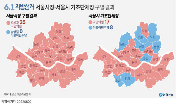 국민의힘은 종로(정문헌), 중구(김길성), 용산(박희영), 광진(김경호), 동대문(이필형), 도봉(오언석), 서대문(이성헌), 마포(박강수), 양천(이기재), 강서(김태우), 구로(문헌일), 영등포(최호권), 동작(박일하), 서초(전성수), 강남(조성명), 송파(서강석), 강동(이수희)에서 민주당을 누르고 구청장을 당선시켰다.