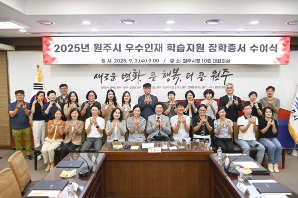 [코리아 이슈저널=최제구 기자] 원주시는 3일 오전 11시 시청 10층 대회의실에서 2025년 원주시 우수인재 학습지원 장학증서 수여식을 개최하고, 우수 학생들의 성취와 노력을 축하했다.