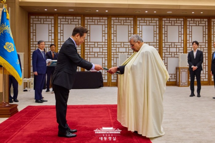 [코리아 이슈저널=최성일 기자] 이재명 대통령은 오늘 오후 대통령실에서 개최된 신임장 제정식에서 신임 주한 상주대사 7명으로부터 신임장을 제출받았다. 신임장 제정식은 파견국의 국가원수가 자국의 신임 대사에게 수여한 신임장을 주재국 국가원수에게 전달하는 절차로, 이번 제정식은 우리 신정부 출범 이후 처음 개최된 것이다.