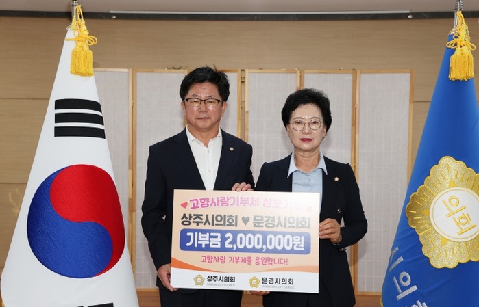 [코리아 이슈저널=김태훈 기자] 상주시의회는 15일, 고향사랑기부제 활성화를 유도하고 지역 상생발전을 도모하기 위해 문경시의회(의장 이정걸)와 고향사랑기부제 상호기부를 진행했다.