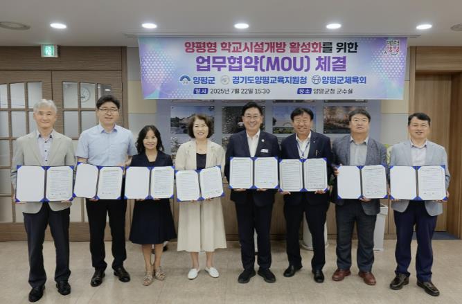 [코리아 이슈저널=홍춘표 기자] 양평군은 지난 22일 양평군과 경기도양평교육지원청, 양평군체육회와 함께 “학교체육시설 개방”을 위한 3자 간 업무협약(MOU)을 체결했다고 밝혔다. 이번 협약은 지자체, 교육기관, 체육단체가 함께 지역사회 생활체육 활성화와 주민복지 개선을 위해 힘을 모으는 의미있는 자리였으며, 학교체육시설 개방 거점학교로 함께 출발하는 강상초, 다문초, 양평동초, 조현초, 양평중 교장선생님들도 함께 자리했다.