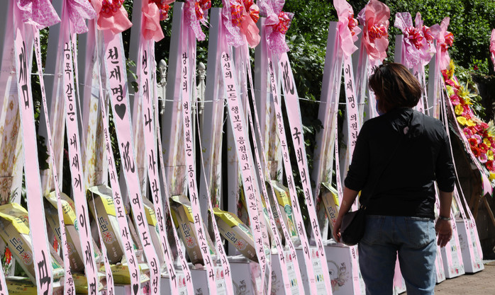 특히 국회 정문 앞과 민주당 당사 등에는 이 고문의 강성 지지층인 이른바 '개딸'들이 보낸 화환들이 죽 늘어서기도 했다.