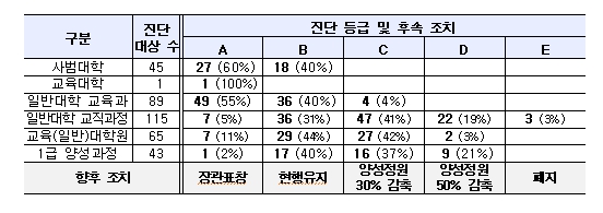 이번 진단 결과에 따라 해당 기관의 2027학년도 교원양성정원이 조정된다. 진단 결과 씨(C) 등급 기관은 정원의 30% 감축, 디(D) 등급 기관은 정원의 50%가 감축되며, 이(E) 등급 기관은 교원양성기능이 폐지될 예정이다.