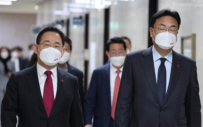 | ▲ 국민의힘 정진석 비상대책위원장과 주호영 원내대표 등 지도부가 29일 국회에서 열린 비상대책위원회 회의에 참석하고 있다. 2022.12.29 |